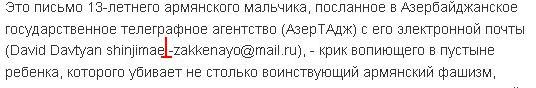 The primary source of this letter indicates AzerTac. All, without exception, the Azerbaijani media provide data with reference to AzerTaj. And in the body of the message quite clearly states that " This letter is 13 years old Armenian boy, sent to the Azerbaijan State Telegraph Agency (AzerTAc) . " In other slvami, riraytery not refuse the fact that the text was written off from the pages of the state news agency.