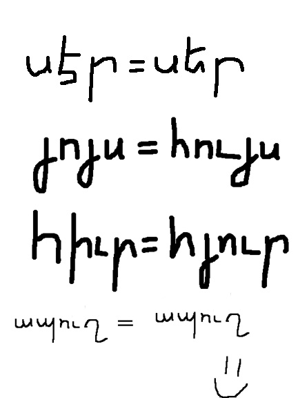 now it is also fair to mention that unfortunately at some points, our spelling is also different(eastern, western) for example, the way Tigran spelled the same word is different. now I don't know how right Tigran(dikran ) is, for unfortunately I haven't had the chance to master my arevelahyeren, but the way I spelled it is the proper way of spelling the word "guest" in arevmdahayeren.