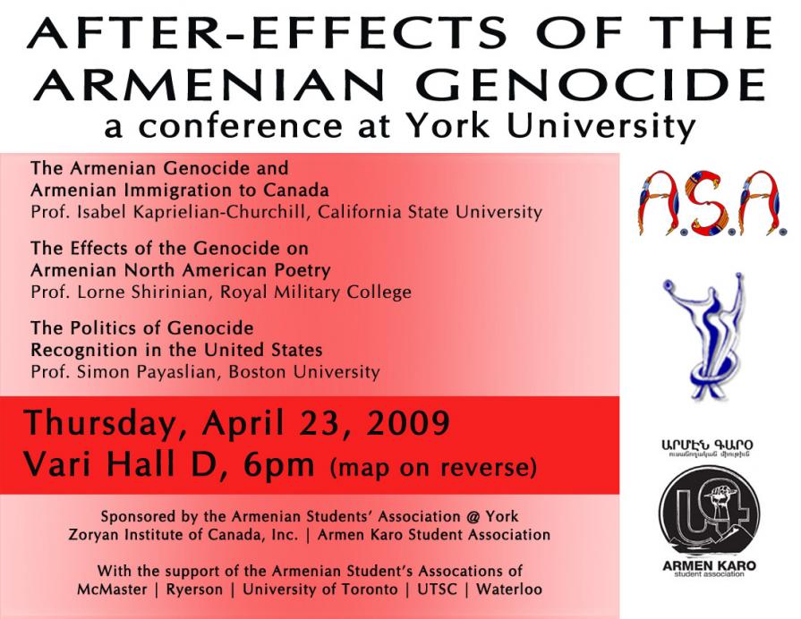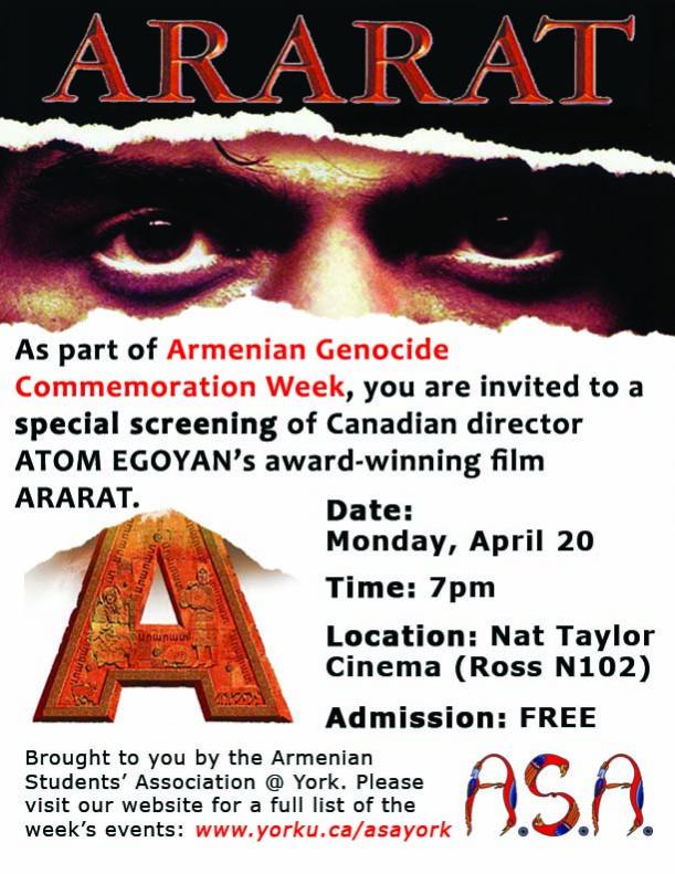 As part of Armenian Genocide Commemoration Week at York University, the Armenian Students' Association @ York will be screening Atom Egoyan's Ararat and will be hosting a conference on the aftermath of the Genocide.