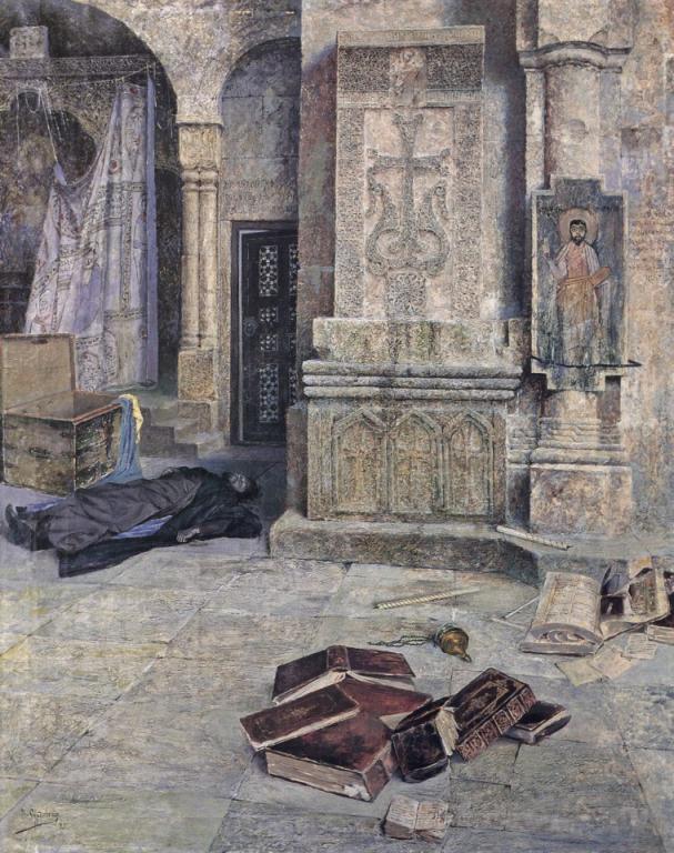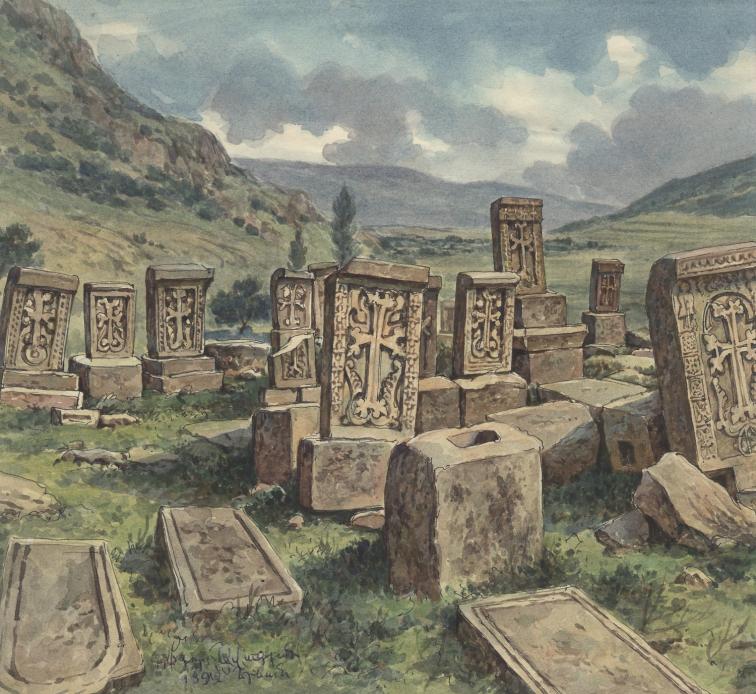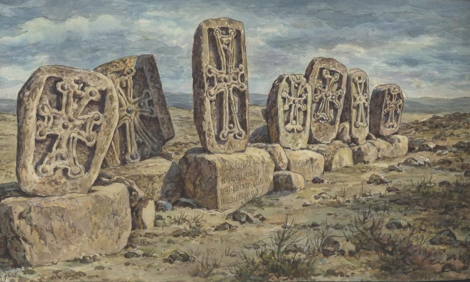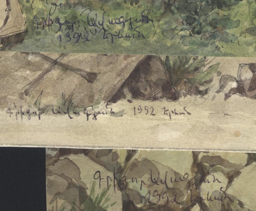 In Yerevan in the 1990s I bought some watercolours depicting khachkars. I don't know the name of the artist. There is a short pen-writen inscription on each watercolour. I think the first part of it might describe the subject and the word after the 1992 date might be the artist's name - but I can't decipher it. Can anyone?