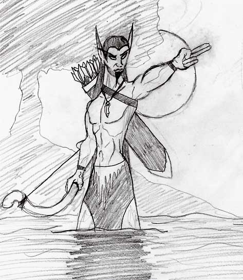LOL I just REALLY quickly drew a night elf standing knee deep in water and pointing at something... I'm not a very good artist and this REALLY has little to do with fashion since he's mostly nude for the ladies... I think the only thing I'm even decent at drawing is torsos.