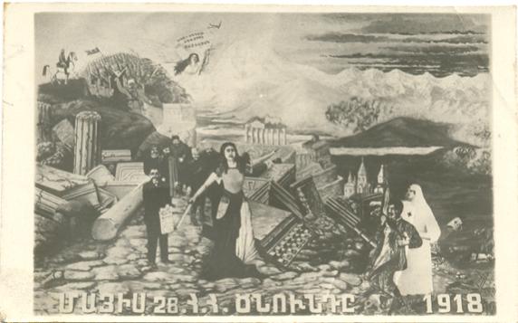 The female figure is a personification of Armenia. The male figure, I don't know, maybe also symbolising Armenia or maybe an historical personage. His sword is broken, but so is the chain around his ankles. The eagle also has broken chains. Scattered around are various tools and instruments, all signifying a degree of civilisation. At the far right, headed by a flying figure of Death carrying a sickle, is an advancing horde of Muslim warriors with a crescent flag.Attached Files
