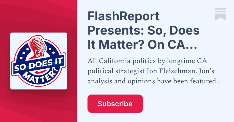 All California politics by longtime CA political strategist Jon Fleischman. Jon's analysis and opinions have been featured on FoxNews, CNN, ABC, NBC, CBS, Politico, WSJ, NY Times, WashPost, and all of California's major dailies! Click to read "FlashReport Presents: So, Does It Matter? On CA Politics!", by Jon Fleischman, a Substack publication.